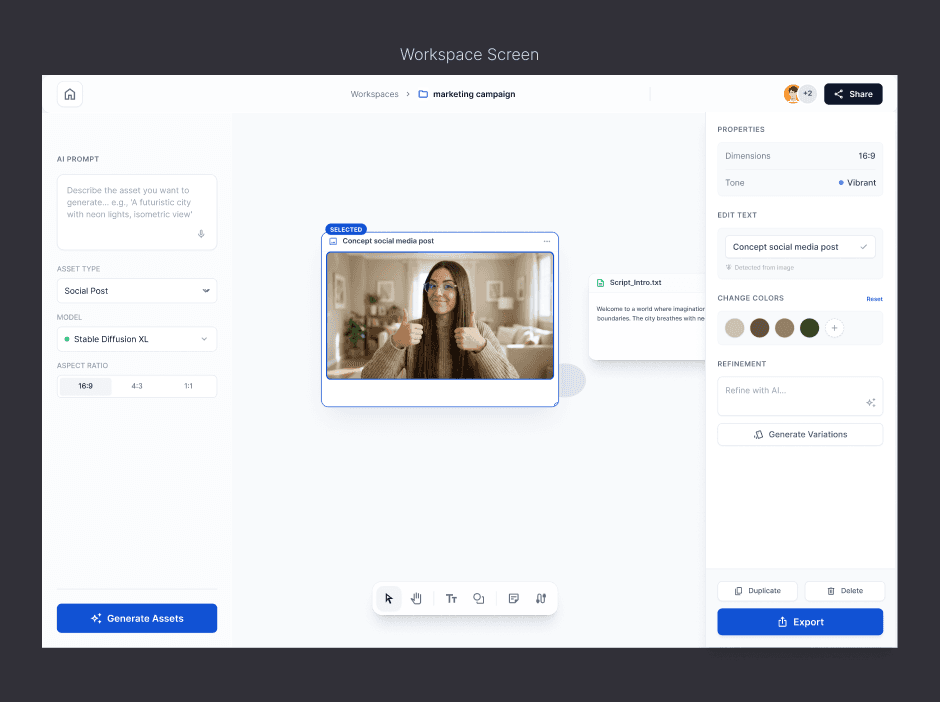 Creators often rely on disconnected tools to generate content, manage assets, edit variations, and export final outputs. While AI has accelerated content creation, it has not solved the fragmentation of the creative workflow itself. This results in frequent context switching, broken creative momentum, and poor visibility into how assets evolve within a project. The goal was to design a system that supports the full lifecycle of creative assets while keeping creators focused on execution.